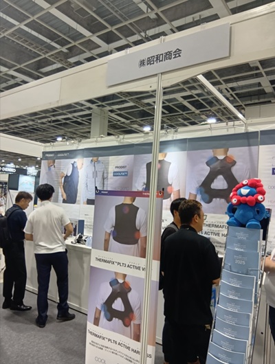 これまで同社では、保冷パックを取り入れた水冷ベストや、気化熱を利用した冷却ベストを販売し、納入実績を重ねてきた。現在販売に力を入れている同シリーズは、同社のオリジナル商品である。ペルチェ素子を採用した冷却デバイスを首元に2個配置し、さらに腰付近には小型ファンを2個取り付けている。ファンの気化熱により体全体が冷却され、首元のペルチェにより冷涼効果を高める原理だ。水冷ベストと気化熱ベストの特徴を一つにまとめ、重量感も感じさせない製品となっている。さらに素材はUVカット加工が施されており、遮熱効果も得られ快適性が向上している。