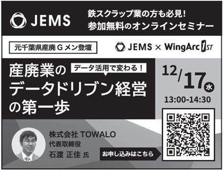 (茨城)リサイクル業界向け販売管理システムの開発・販売を手掛けるJEMS(本社=茨城県つくば市、須永裕毅代表取締役)は12月17日13時より、廃棄物処理・資源リサイクル業者向けのセミナー「データ活用で変わる!産廃業のデータドリブン経営の第一歩」をオンラインで無料開催する。同社は1日に環境将軍Rのデータを経営判断に活用できる「経営ダッシュボード」をリリース。セミナーはこれを記念し開催する。
