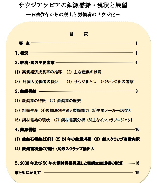 鉄リサイクリング・リサーチの林誠一社長が1月20日付で、調査レポートNO107『サウジアラビアの鉄源需給・現状と展望 ―石油依存からの脱出と労働者のサウジ化 ―』を発表した。同国の経済や鉄鋼業、鉄源需給の現状や展望を考察している。