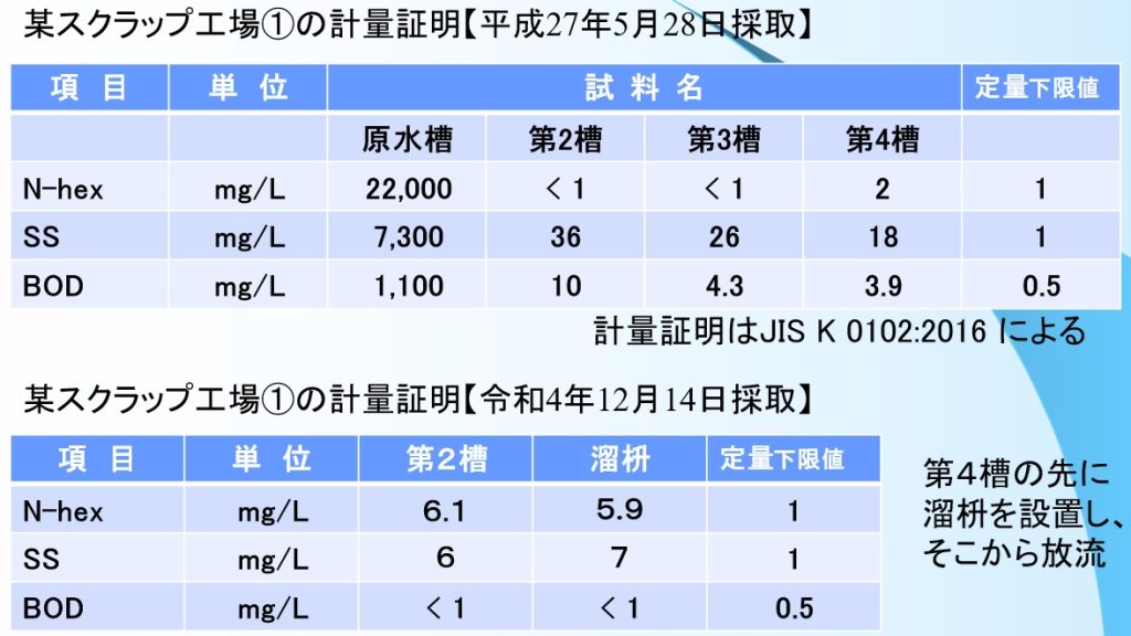 同社がスクラップ工場で実施した測定では、原水槽に含まれていたノルマルヘキサン(N-hex)、懸濁物質(SS)、有機物(BOD)が放流時において基準値以下に低減したことを確認している(※表)。